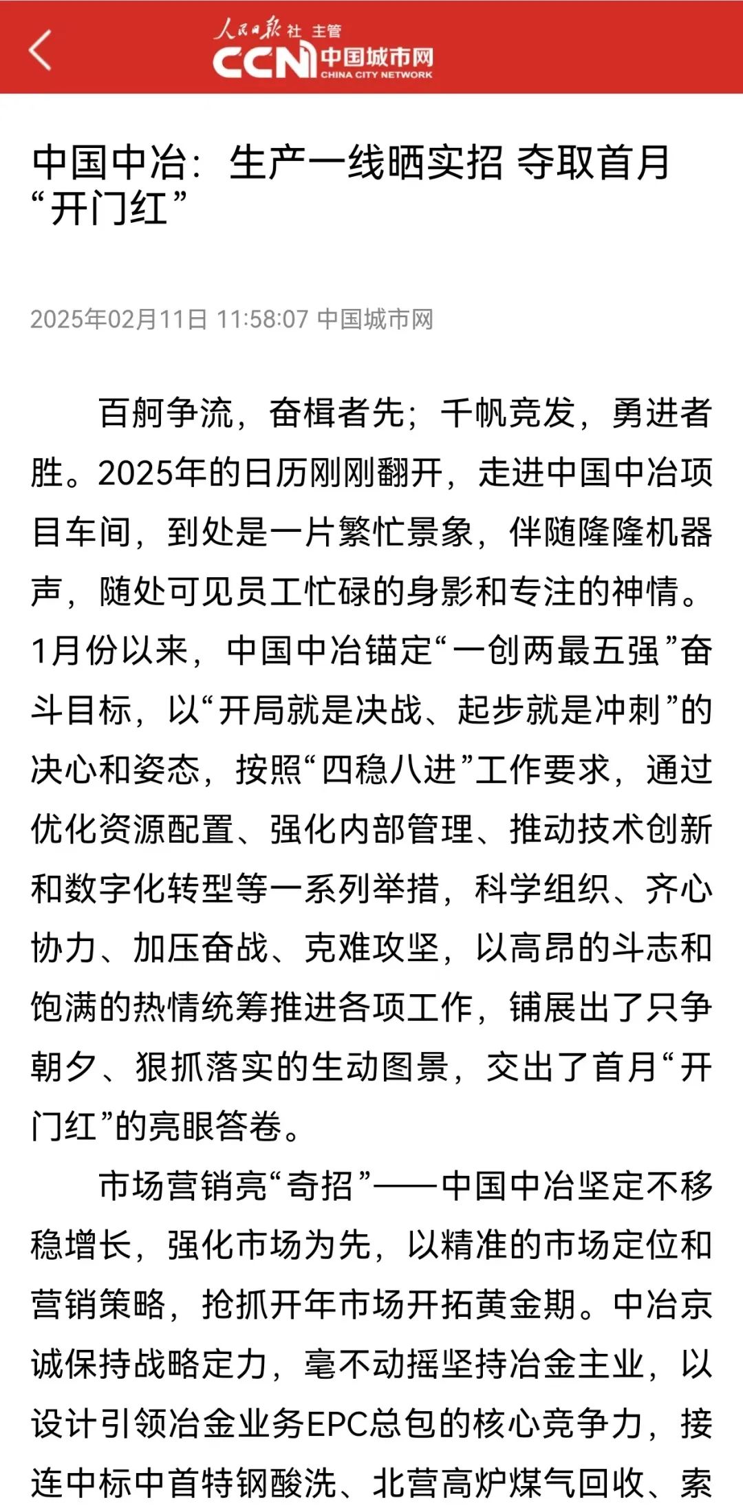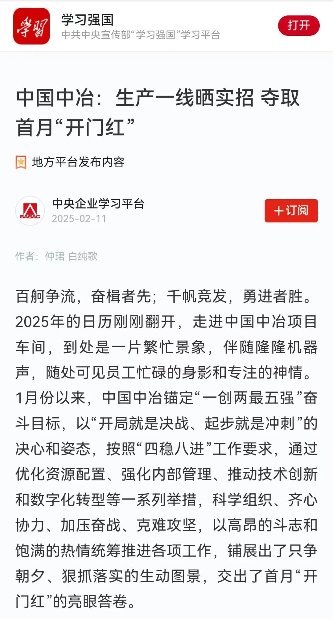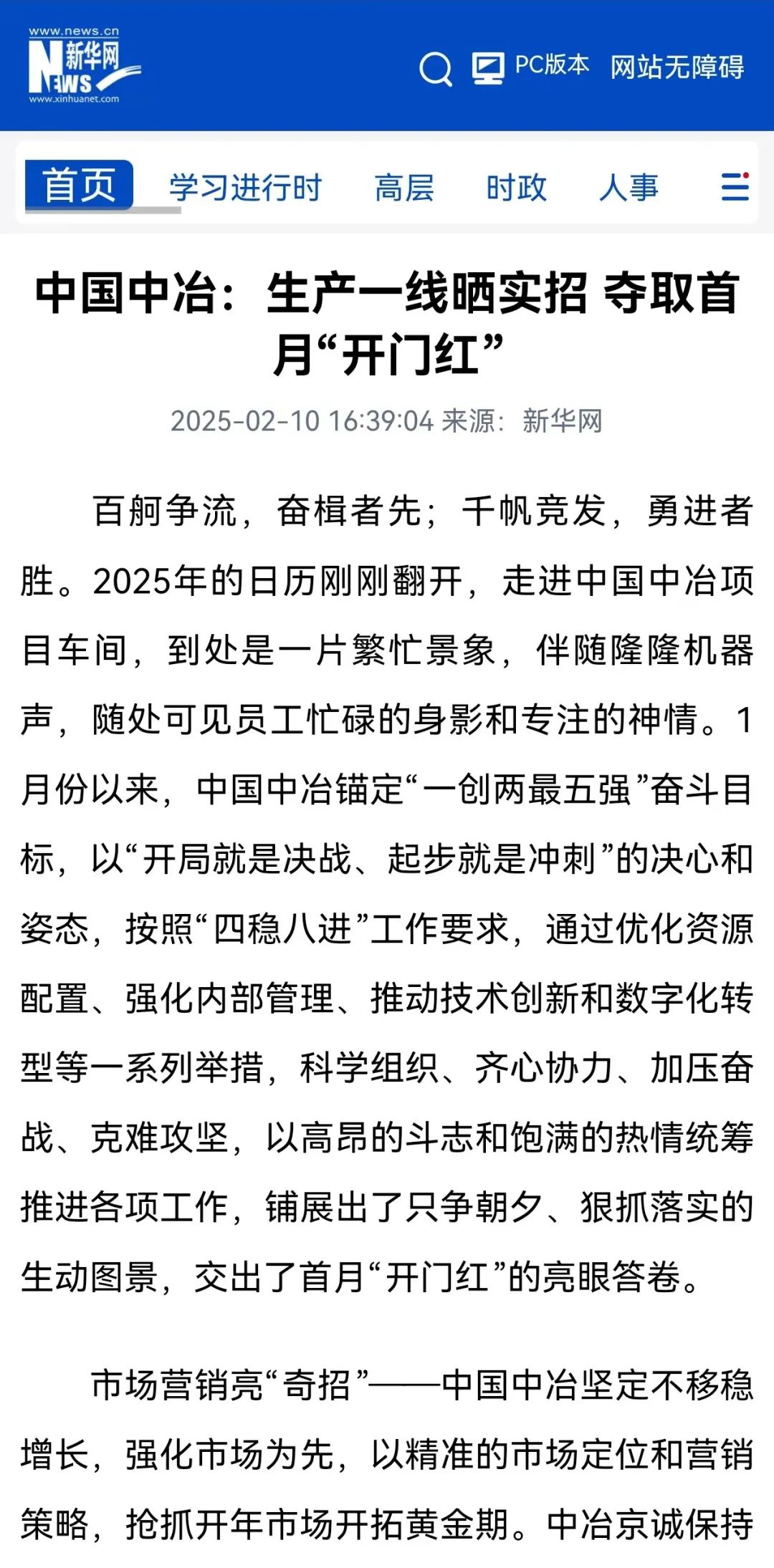 拼抢一季度,奋战开门红。1月份以来,中国中冶锚定“一创两最五强”奋斗目标,以“开局就是决战、起步就是冲刺”的决心和姿态,按照“四稳八进”工作要求,通过优化资源配置、强化内部管理、推动技术创新和数字化转型等一系列举措,科学组织、齐心协力、加压奋战、克难攻坚,以高昂的斗志和饱满的热情统筹推进各项工作,铺展出了只争朝夕、狠抓落实的生动图景,交出了首月“开门红”的亮眼答卷。