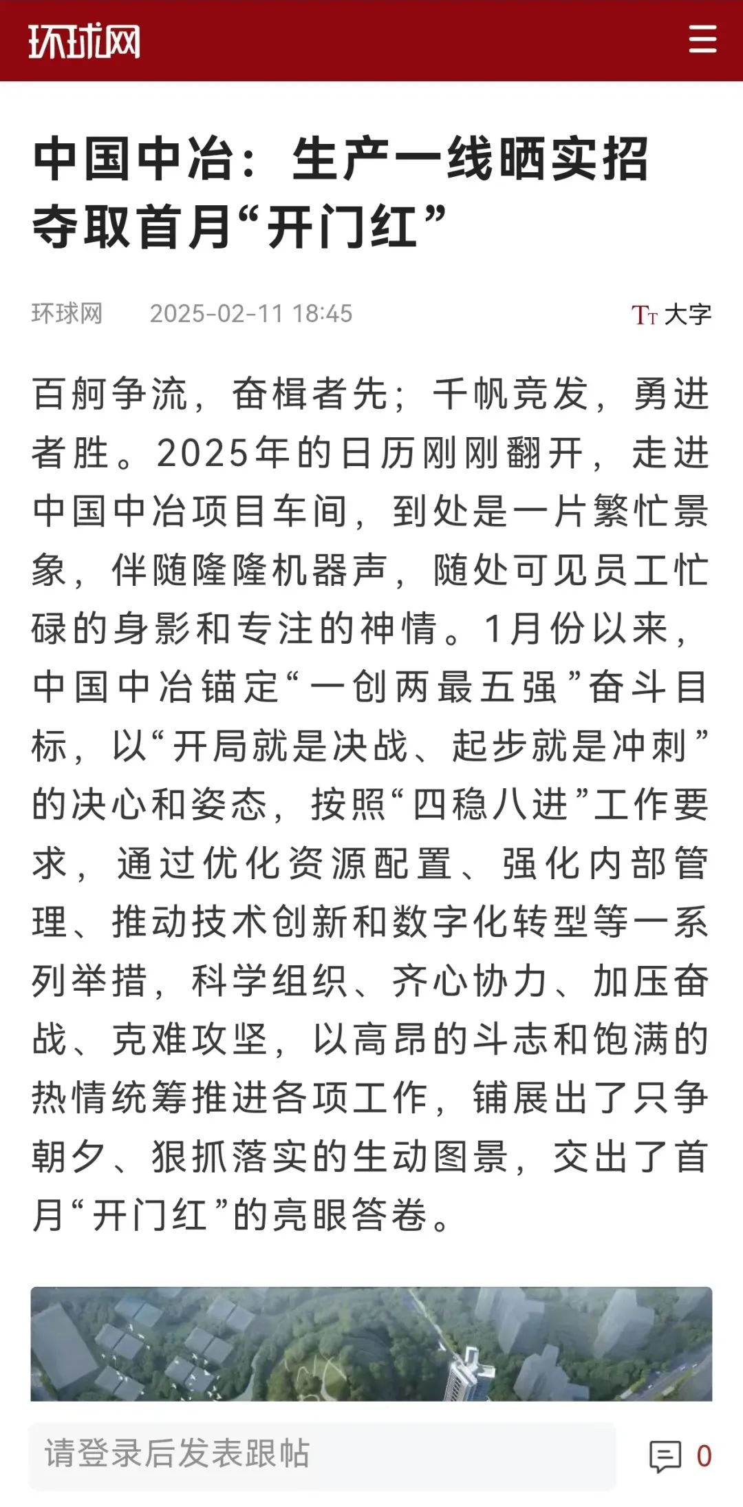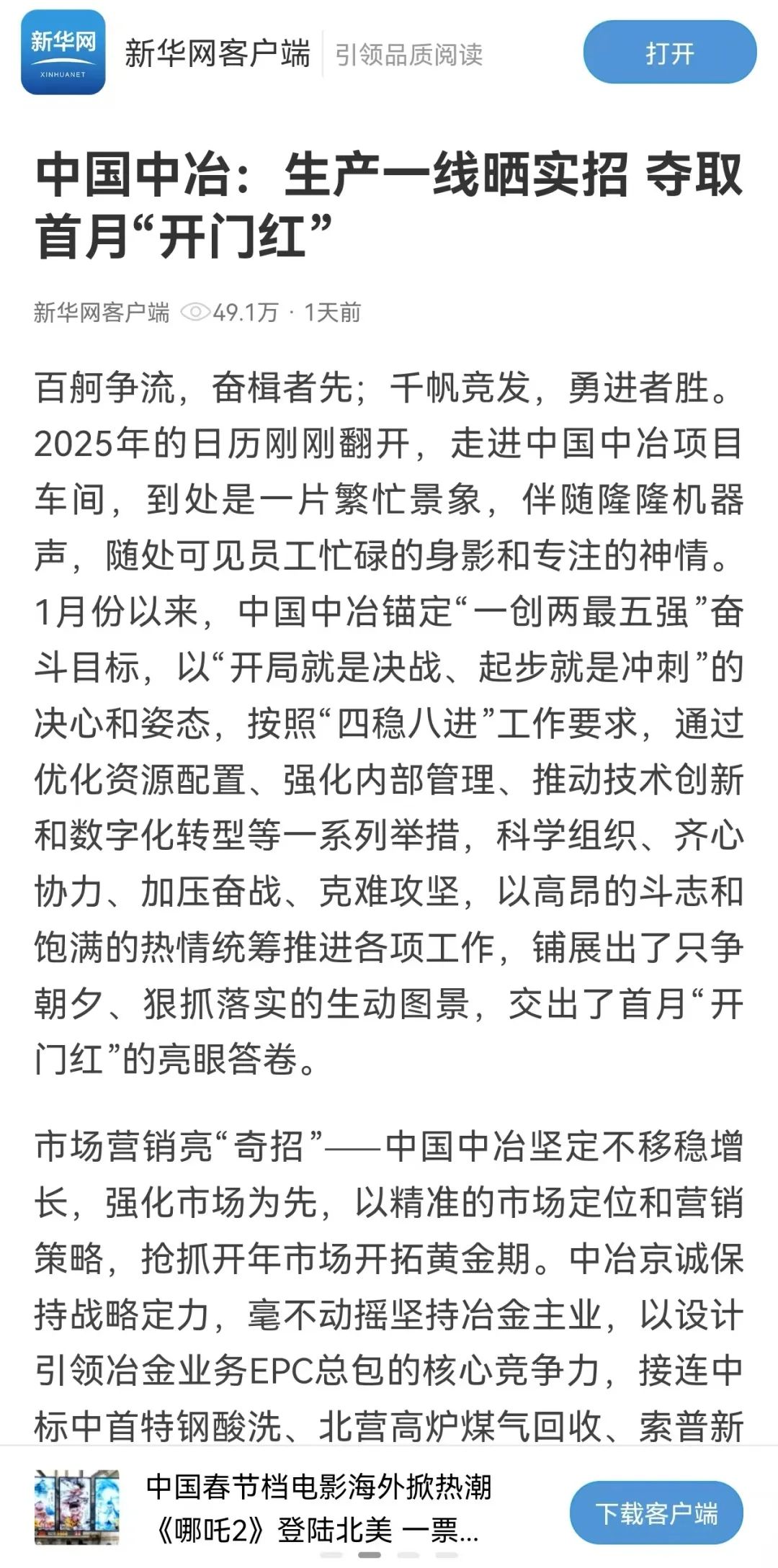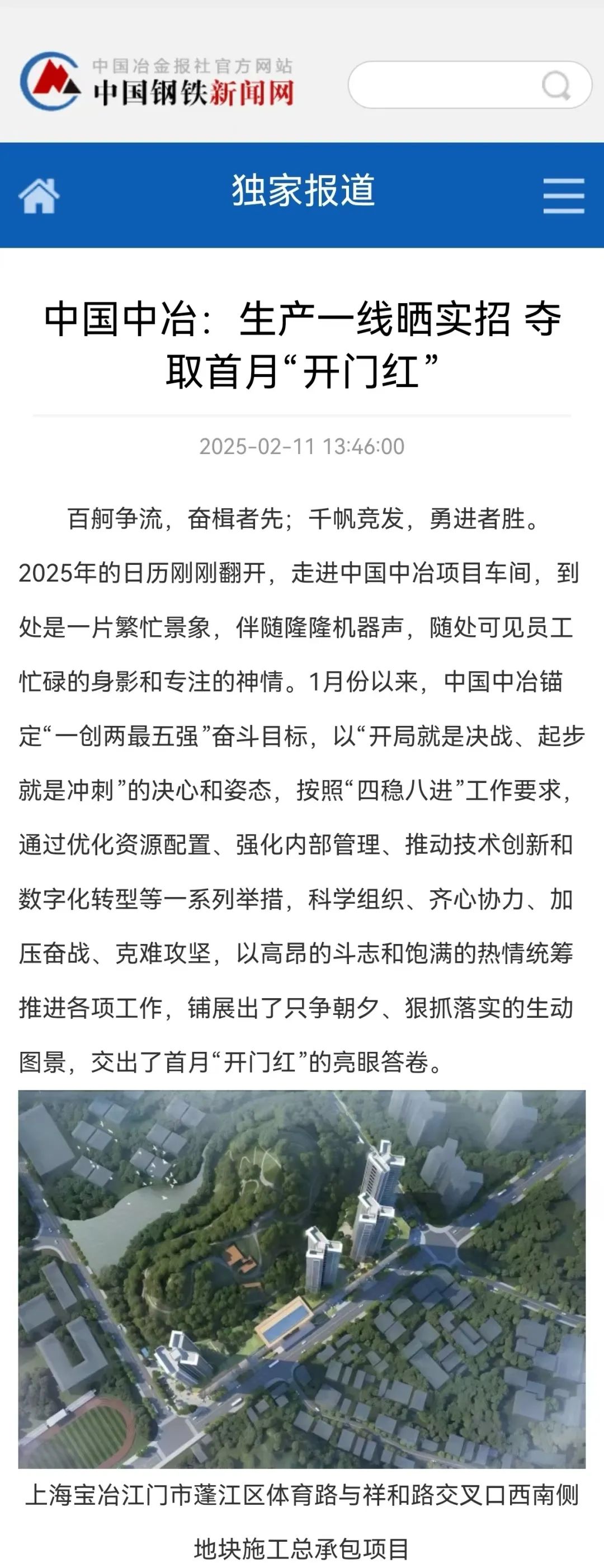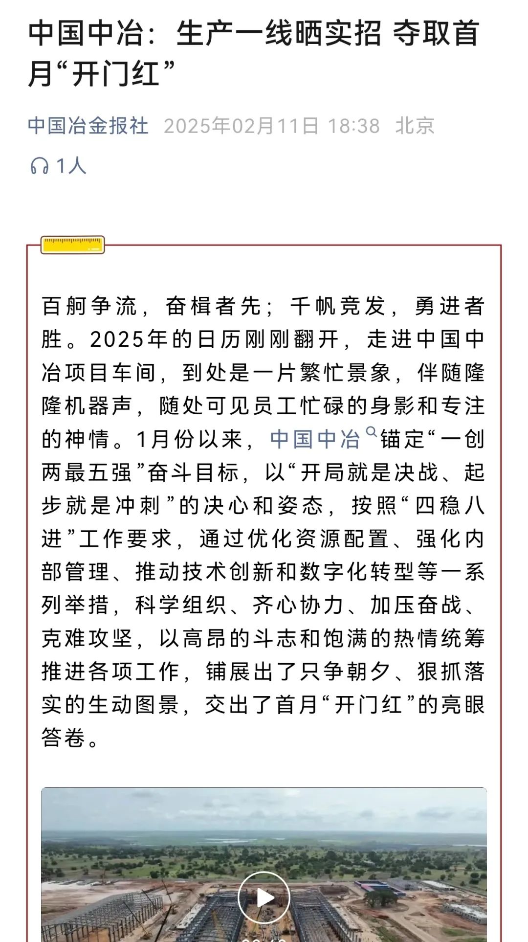 拼抢一季度,奋战开门红。1月份以来,中国中冶锚定“一创两最五强”奋斗目标,以“开局就是决战、起步就是冲刺”的决心和姿态,按照“四稳八进”工作要求,通过优化资源配置、强化内部管理、推动技术创新和数字化转型等一系列举措,科学组织、齐心协力、加压奋战、克难攻坚,以高昂的斗志和饱满的热情统筹推进各项工作,铺展出了只争朝夕、狠抓落实的生动图景,交出了首月“开门红”的亮眼答卷。