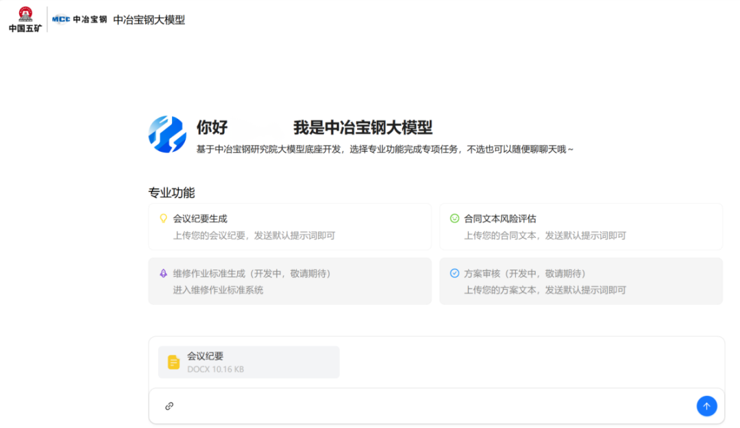 中冶宝钢大模型平台与DeepSeek 32B版本实现对接,通过深度融合冶金设备运维、生产管理等领域的专业知识库,搭建起功能强大的多格式文档解析平台,该平台支持PDF、Word、Excel等多种常见文件格式的上传与处理,能够高效应对复杂多样的文档处理需求。目前已具备智能会话辅助、会议纪要生成、合同条款筛查等功能。后续将持续优化,不断提高系统的响应速度和应用能力,推进平台向DeepSeek 70B版本过渡升级。