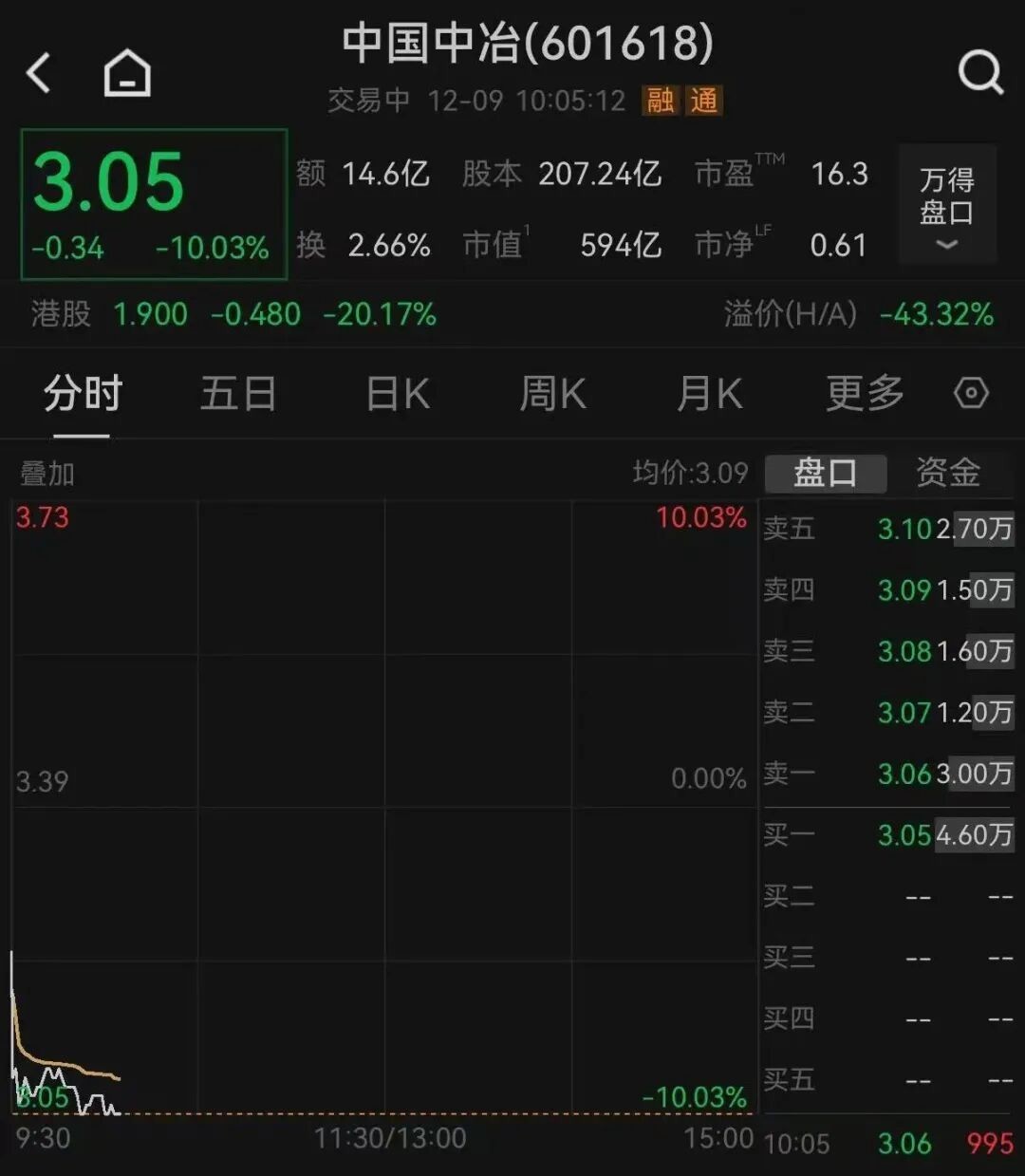 12月9日,央企控股上市公司 中国中冶 A股触及跌停,港股大跌超20%。