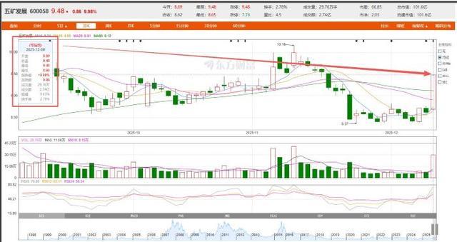12月9日早盘的A股市场,五矿系两家上市公司的股价走势呈现戏剧性分化。 五矿发展 盘中震荡上行,上午10时后短短10分钟内,先遭遇2.29万手大单抛售,随即被2.28万手买单承接,股价迅速冲至10%涨停板。