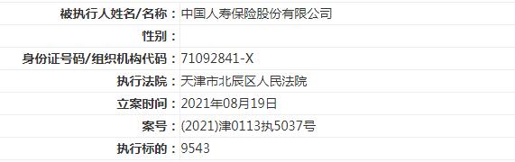 据中国执行信息公开网消息,近日,中国人寿(601628)保险股份有限公司(以下简称“中国人寿”)被天津市北辰区人民法院列为被执行人,执行标的9543元。案号为(2021)津0113执5037号,立案日期为2021年8月19日。