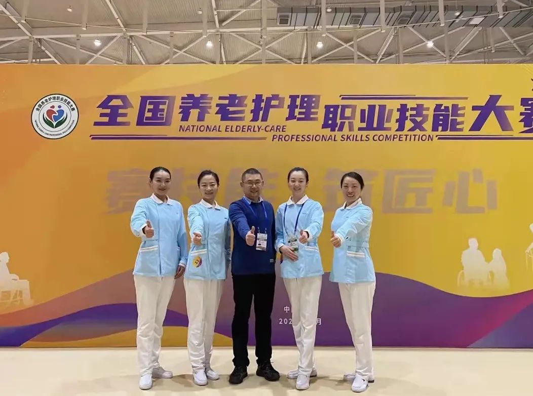 “喜报:在刚刚揭晓的全国养老护理职业技能大赛决赛中,我院优秀毕业生翟浩霖获得一等奖,谢隽老师荣获全国优秀教练。这是我们保院的骄傲!”