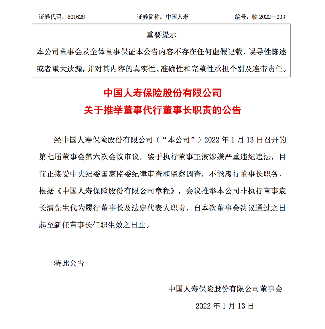 1月13日,中国人寿保险股份有限公司发布公告表示,经第七届董事会第六次会议审议,鉴于执行董事王滨涉嫌严重违纪违法,目前正接受中央纪委国家监委纪律审查和监察调查,不能履行董事长职务。根据《中国人寿保险股份有限公司章程》,会议推举该公司非执行董事袁长清代为履行董事长及法定代表人职责,自本次董事会决议通过之日起至新任董事长任职生效之日止。