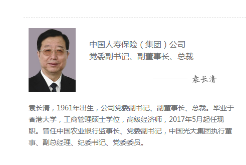 中国人寿官网资料显示,袁长清,1961年出生,公司党委副书记、副董事长、总裁。毕业于香港大学,工商管理硕士学位,高级经济师,2017年5月起任现职。曾任中国农业银行监事长、党委副书记,中国光大集团执行董事、副总经理、纪委书记、党委委员。