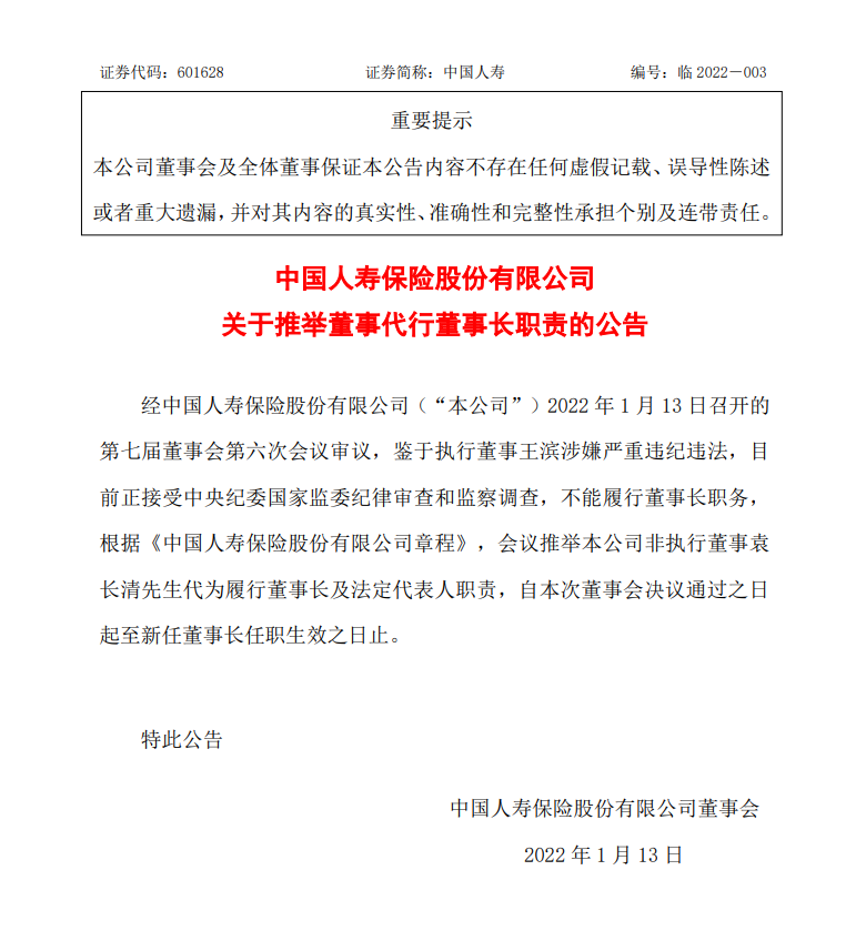 经中国人寿保险股份有限公司(“本公司”)2022 年 1 月 13 日召开的第七届董事会第六次会议审议,鉴于执行董事王滨涉嫌严重违纪违法,目前正接受中央纪委国家监委纪律审查和监察调查,不能履行董事长职务。