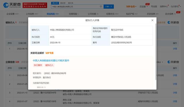 信息显示,6月15日,中国人寿保险股份有限公司被福建省莆田市秀屿区人民法院列为被执行人,执行标的44元。