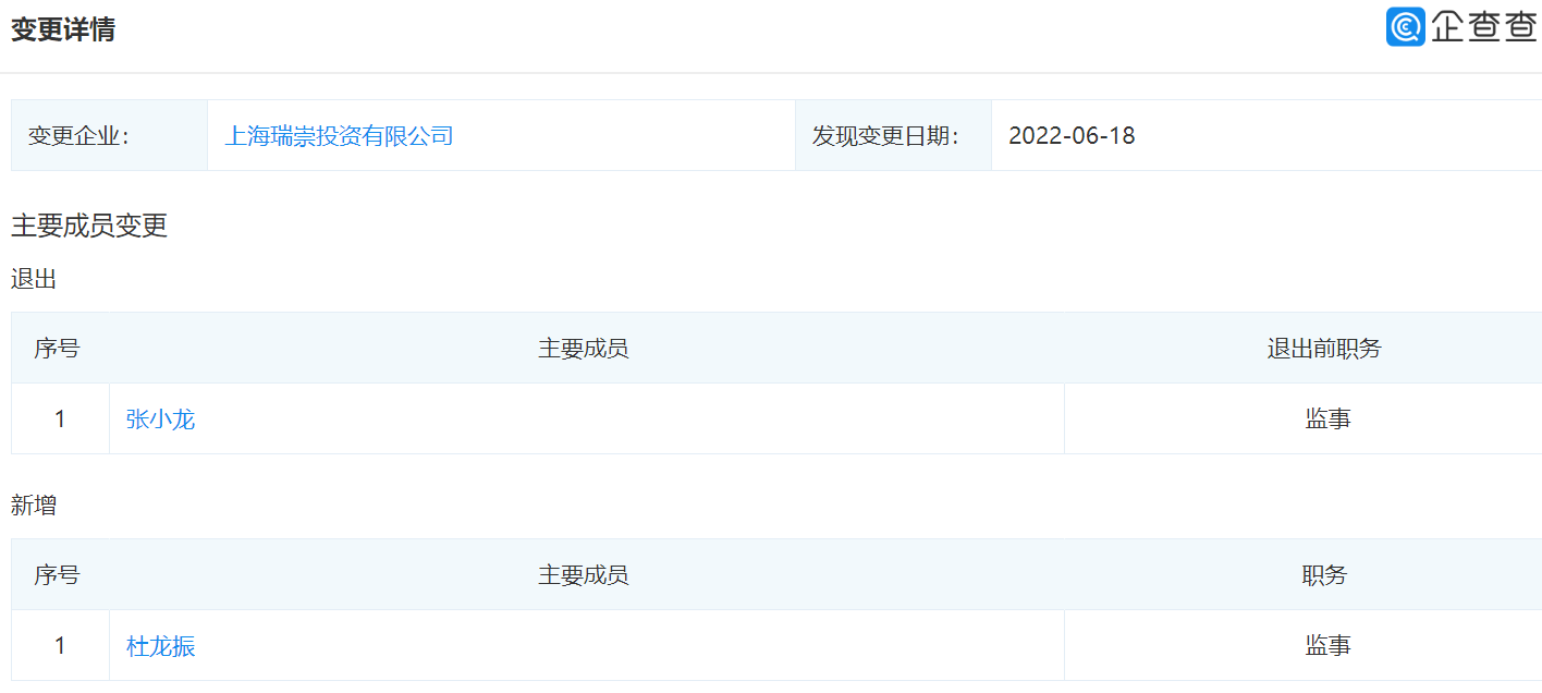 6月22日消息,上海瑞崇投资有限公司发生工商变更,高管中张小龙卸任监事一职,由杜龙振接任。