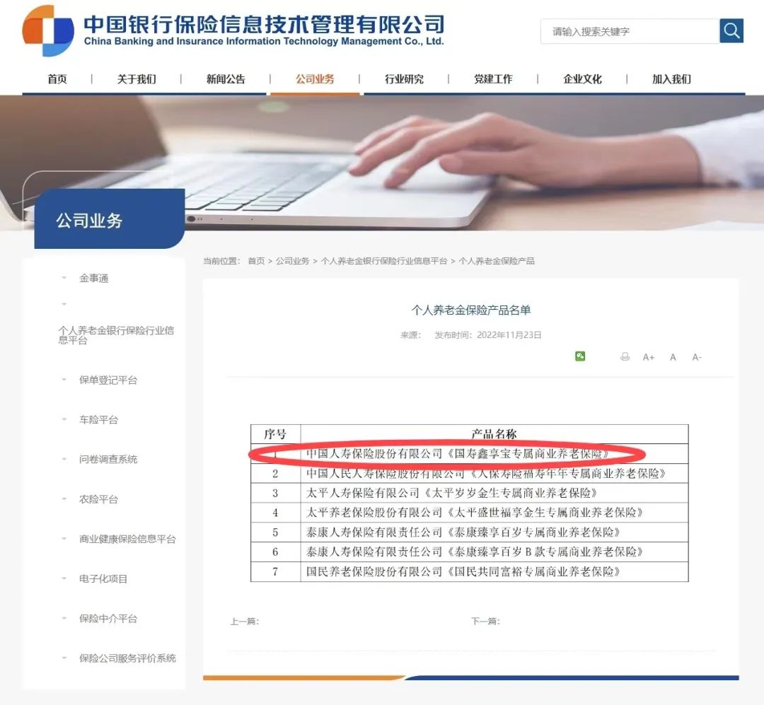 11月23日,中国银行保险信息技术管理有限公司披露了首批个人养老金保险产品名单,包含6家险企的7款产品。中国人寿集团旗下寿险公司首款个人养老金产品——国寿鑫享宝专属商业养老保险被列入该产品名单。