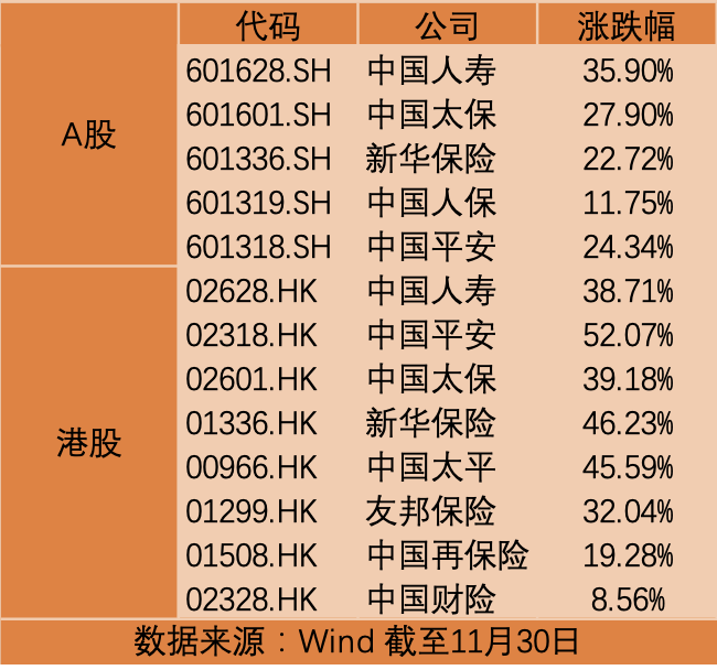 在A股市场,中国人寿11月份上涨35.9%,领涨保险股,中国太保、中国平安、新华保险的股价涨幅也均超过20%。在港股市场中,保险股的涨幅更为亮眼,中国平安月内大涨52.07%,新华保险、中国太平的股价涨幅均超过40%,中国太保、中国人寿、友邦保险的涨幅也超过30%。