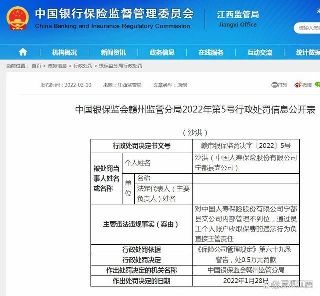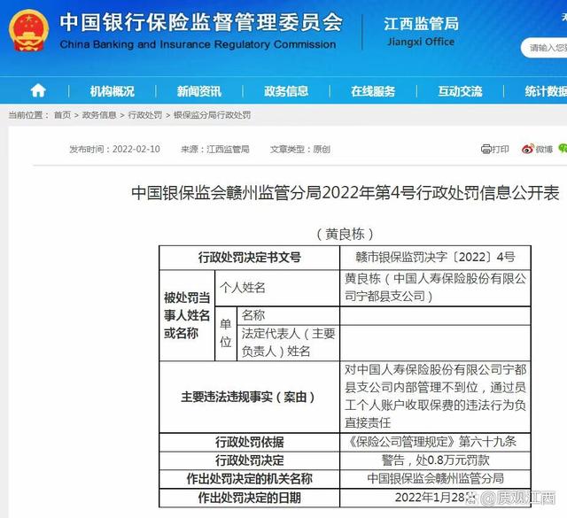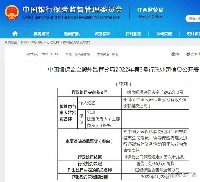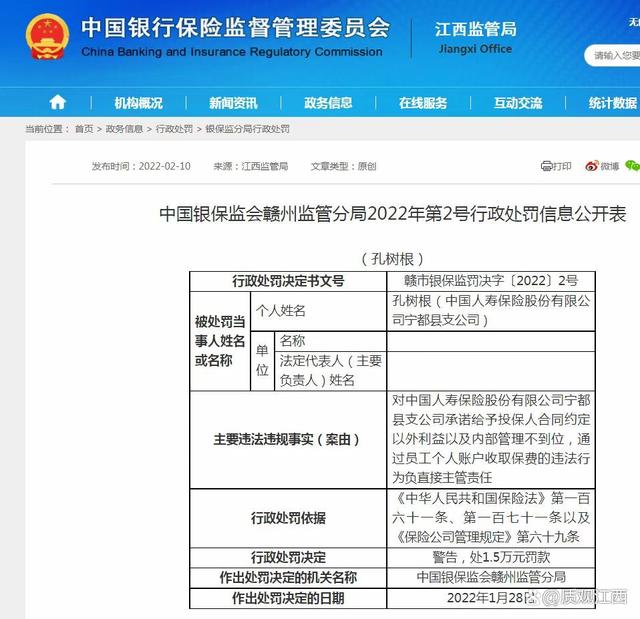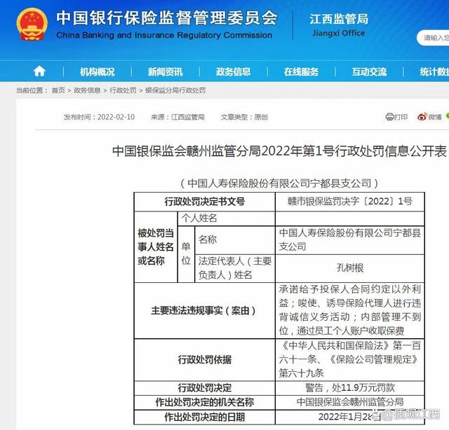 今年1月28日,上述机关对中国人寿保险股份有限公司宁都县支公司作出行政处罚,主要违法违规事实为:“承诺给予投保人合同约定以外的利益”、“唆使、诱导保险代理人进行违背诚信义务活动”、“内部管理不到位,通过员工个人账户收取保费”。最终,决定给予该公司11.9万元罚款。
