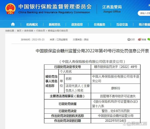 今年5月16日,上述机关对中国人寿保险股份有限公司信丰县支公司作出行政处罚,主要违法违规事实为:因管理不善,导致许可证遗失。最终,决定给予该公司0.9万元罚款。