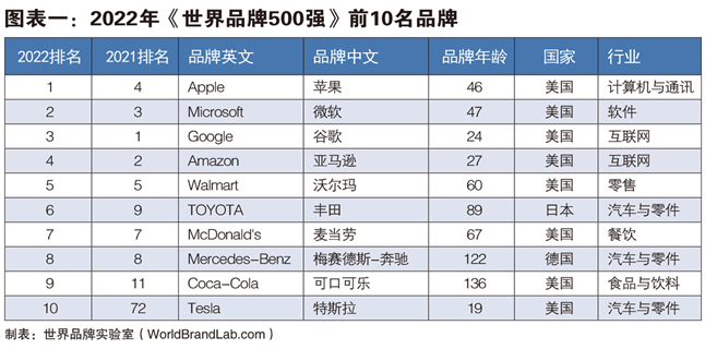 从前十名来看,去年排名第四的苹果跃居第一;微软击败谷歌位居第二;因业绩增长乏力的谷歌退居第三。第四名至第十名分别为:亚马逊、沃尔玛、丰田、麦当劳、梅赛德斯-奔驰、可口可乐、特斯拉。