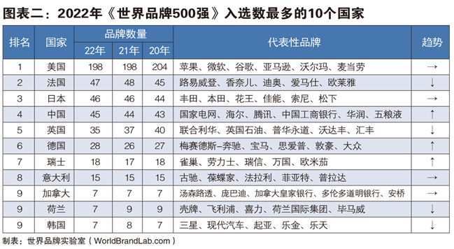 扬子晚报网12月15日讯,由世界品牌实验室独家编制的2022年度(第十九届)《世界品牌500强》排行榜于12月15日在美国纽约揭晓。中国品牌入选数(45个)超越英国(35个),继续保持第四名的好成绩,其中表现亮眼的品牌有国家电网、海尔、华润、中国人寿、五粮液、青岛啤酒、周大福、中化、中国南方电网、恒力、徐工和北大荒。