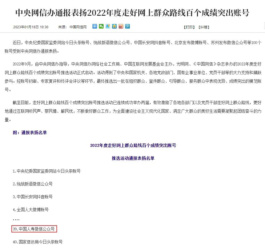 近日,中央网信办通报表扬2022年度走好网上群众路线百个成绩突出账号,“中国人寿”官微位列其中,与中央纪委国家监委网站头条号、国务院客户端微信号、国家发展改革委抖音号等一起受到通报表扬,入选全国百佳账号。在此次评选中,金融行业仅有2个账号入选,“中国人寿”官微为其中之一。