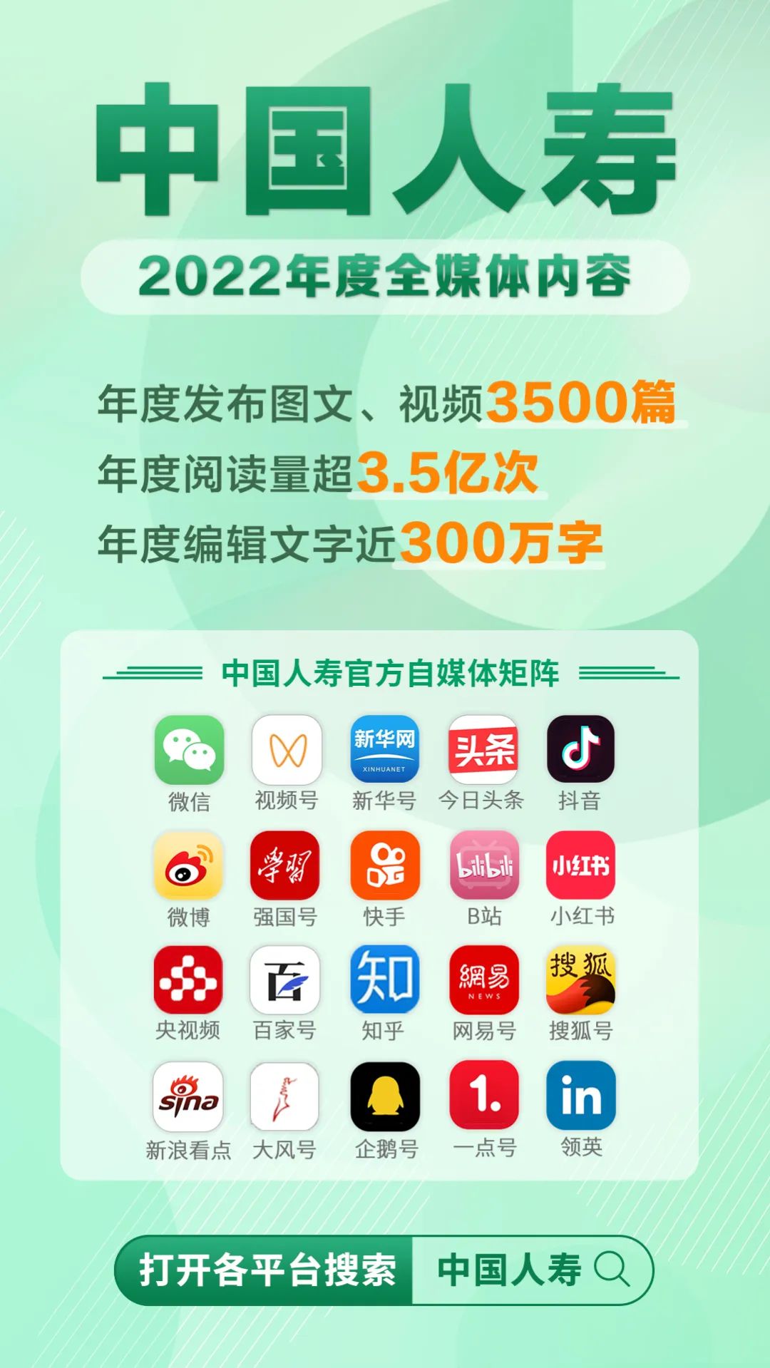 目前,中国人寿集团官方自媒体矩阵已实现主流新闻媒体、社交及音视频平台全覆盖,以官方微信为代表的一批特色账号走在行业融媒前列。