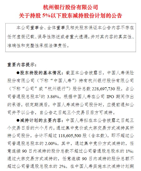 截至公告披露日,中国人寿持有杭州银行股份总数2.29亿股,占杭州银行普通股总股本的3.86%。