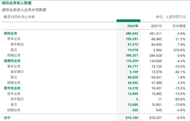 除了撑起人寿保费收入大半壁江山的寿险业务总保费微增之外,中国人寿健康险、意外险业务保费收入均呈下滑态势。寿险业务中,2022年首年业务保持良好涨势,保费较2021年同比提升184.09亿元,变动率为21.2%。