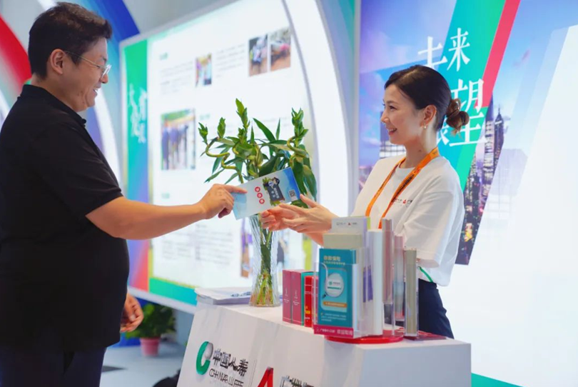 在服贸会的金融展区9号厅,中国人寿(601628)-广发银行的联合展位以三色环的独特形象吸引了众多来访者的围观,方形的巨大入口上方标有“中国人寿-广发银行”联合LOGO,彰显出一家世界500强金融央企以打造综合金融为核心竞争力的服务形象。