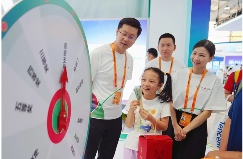 走进展厅,小小的接待台俨然变成了一个“银行窗口”,广发银行信用卡、零售信贷、养老金、跨境人民币等业务宣传资料一应俱全,摆放得整整齐齐。随即进入一个圆形的“通道”之中,一种时空穿梭的科技感扑面而来。广发银行的工作人员早早来到这里,身着印有“中国人寿-广发银行”logo的T恤,热情洋溢地为观众进行解说。展会现场,观众们仿佛置身于一个保银协同的金融通道之中,它所通向的,是一条金融助力实体经济、服务国家发展的康庄大道。
