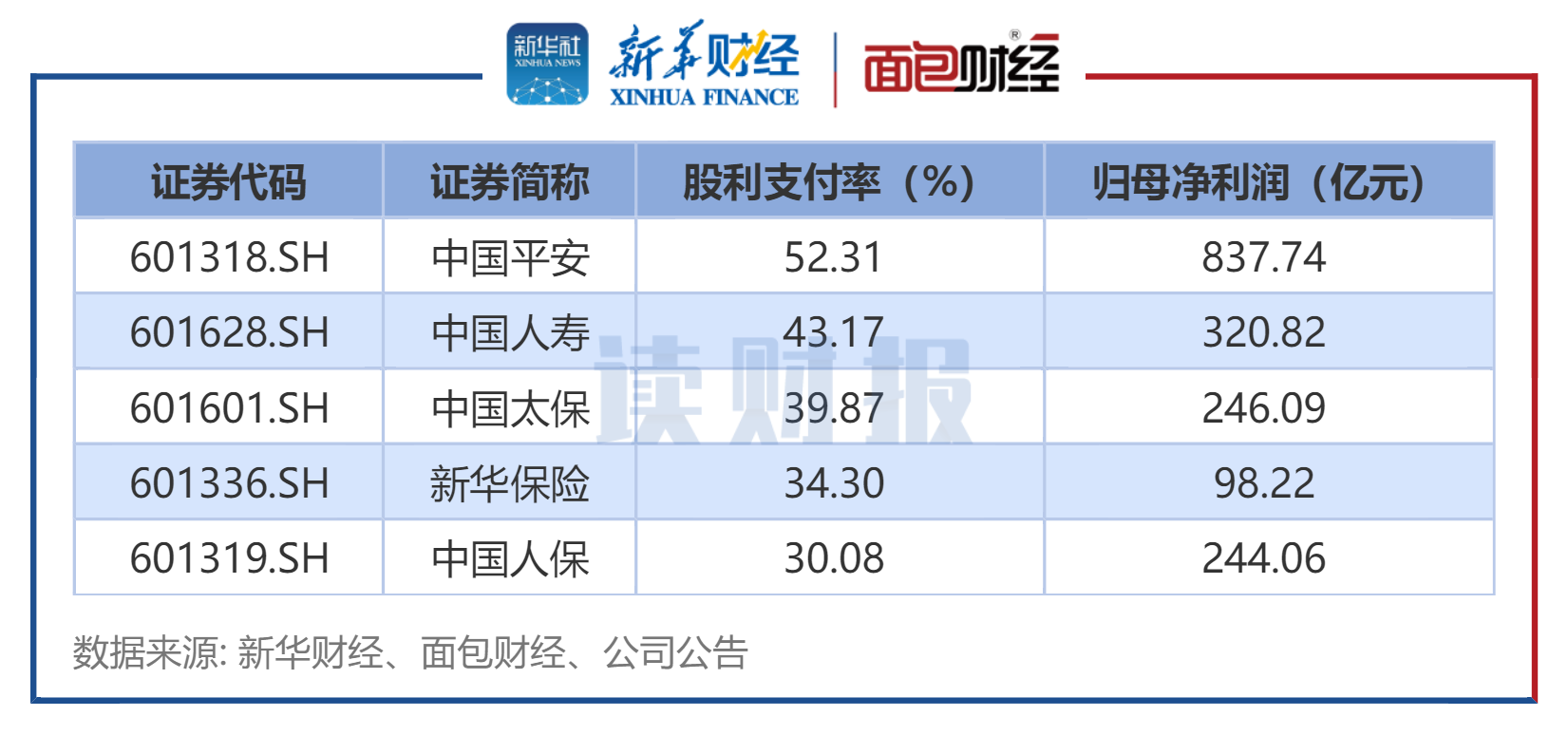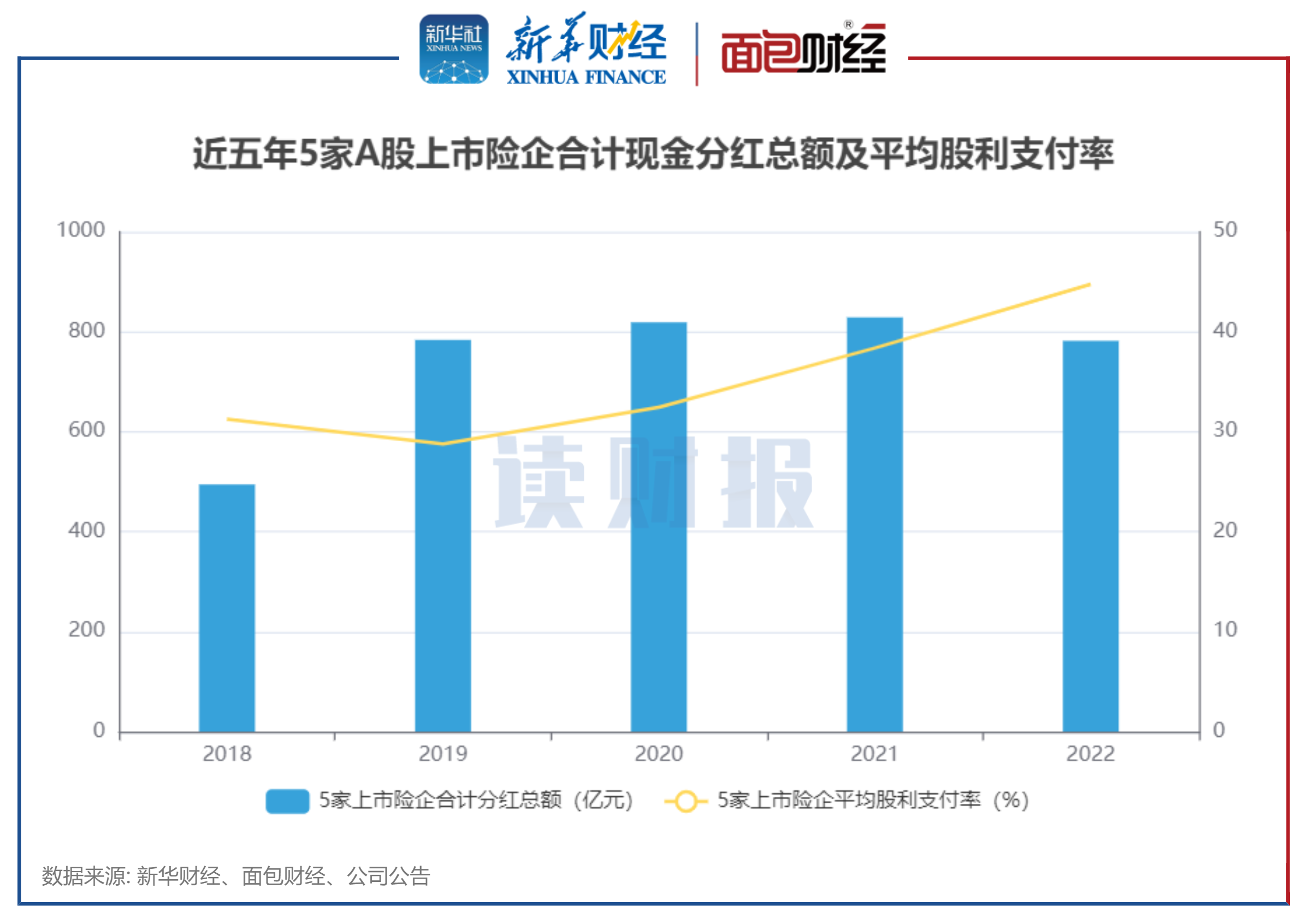 据新华财经和面包财经研究员不完全统计发现,2022年,5家A股上市险企合计分红金额781.93亿元,平均股利支付率(股利支付率指归母净利润中现金分红所占的比重,下同)约44.76%,较2021年平均股利支付率增加约6.39个百分点。