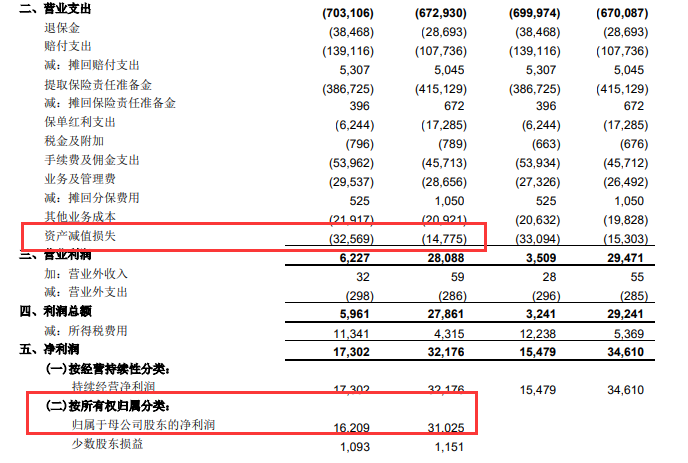 “中国人寿第三季度的归母净利润仅为5300万元,同比下降99.1%,原因则是因为去年在两个低位大规模入市,结果没想到今年股市更困难,前三季度计提资产减值损失326亿。”