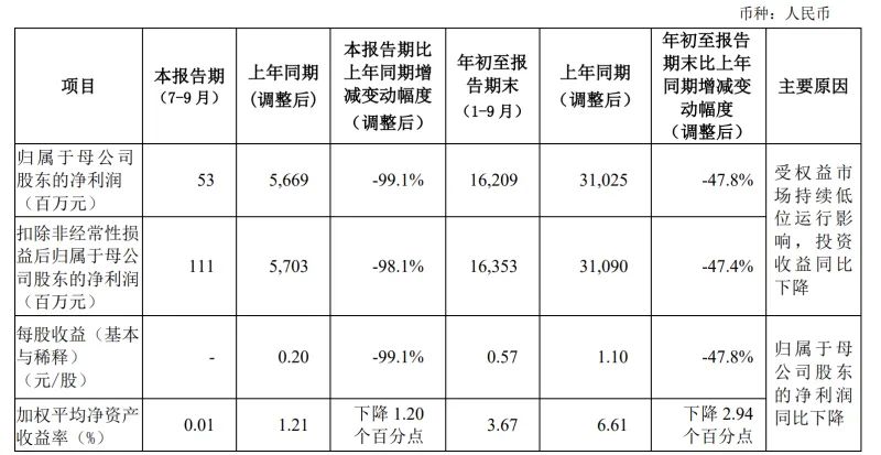 10月26日,中国人寿发布2023年第三季度报告显示,该公司第三季度的归母净利润仅为5300万元,同比下降99.1%;前三季度累计实现归母净利润162.09亿元,同比下降47.8%。