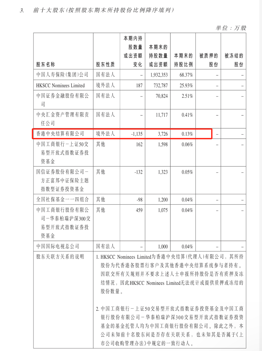 财报披露,今年第三季度期间,北上资金共减持了中国人寿1135万股,占香港中央结算公司持股比的23.35%。