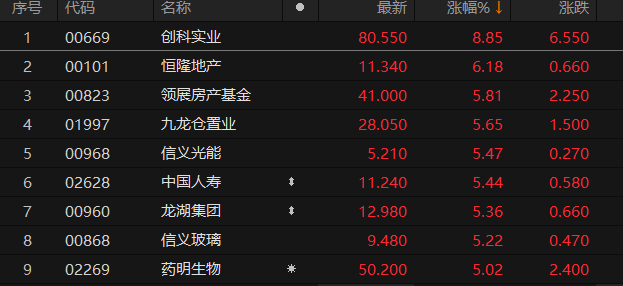 据Choice金融终端数据,截至11月15日14时15分,恒生指数涨幅扩大至3%。创科实业涨超8%,恒隆地产涨超6%,领展房产基金、九龙仓置业、信义光能、中国人寿、龙湖集团等多股涨逾5%。