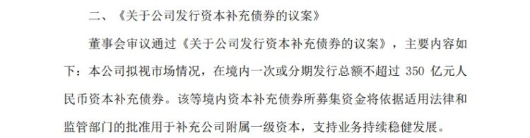 此外,公司董事会审议通过《关于公司发行资本补充债券的议案》,主要内容如下:公司拟视市场情况,在境内一次或分期发行总额不超过350亿元人民币资本补充债券。该等境内资本补充债券所募集资金将依据适用法律和监管部门的批准用于补充公司附属一级资本,支持业务持续稳健发展。董事会同意将该项议案提交股东大会批准,提请股东大会授权董事会,并由董事会转授权管理层在监管机构批准的前提下,根据市场情况,办理本次资本补充债券发行计划内的所有具体事宜并决定发行事项,与发行有关事项的授权期限自股东大会批准之日起至2024年12月31日有效,债券定期计息付息或派息及后续还本或赎回等事项的授权在债券存续期内持续有效。