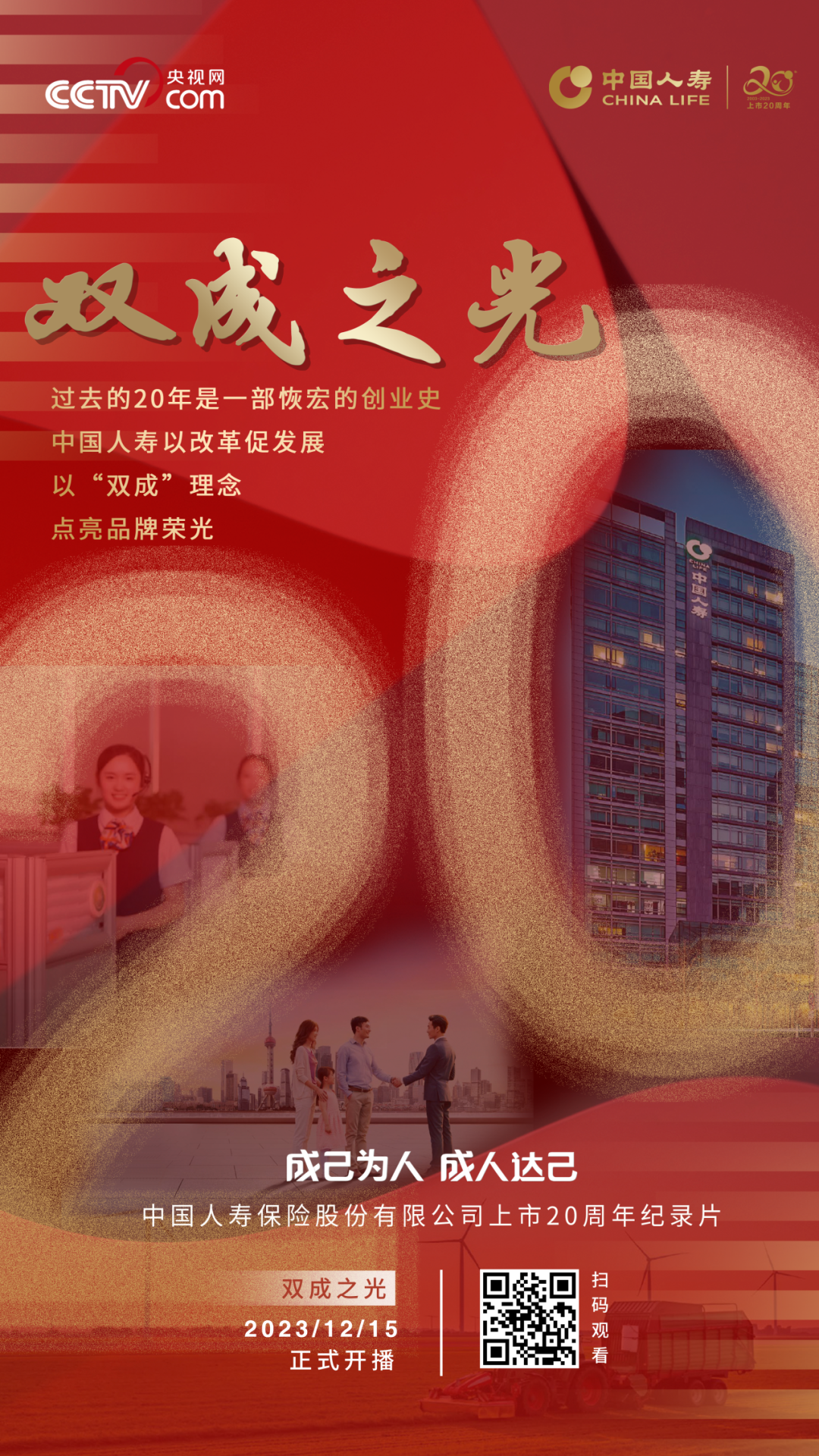 2023年,中国人寿集团旗下寿险公司迎来上市20周年。中国人寿与央视网联袂推出纪录片《双成之光》,以股改上市为线索,回顾20年来公司始终胸怀“国之大者”,坚持以改革促发展、以创新增活力,在不断探索中走出的一条高质量发展之路。
