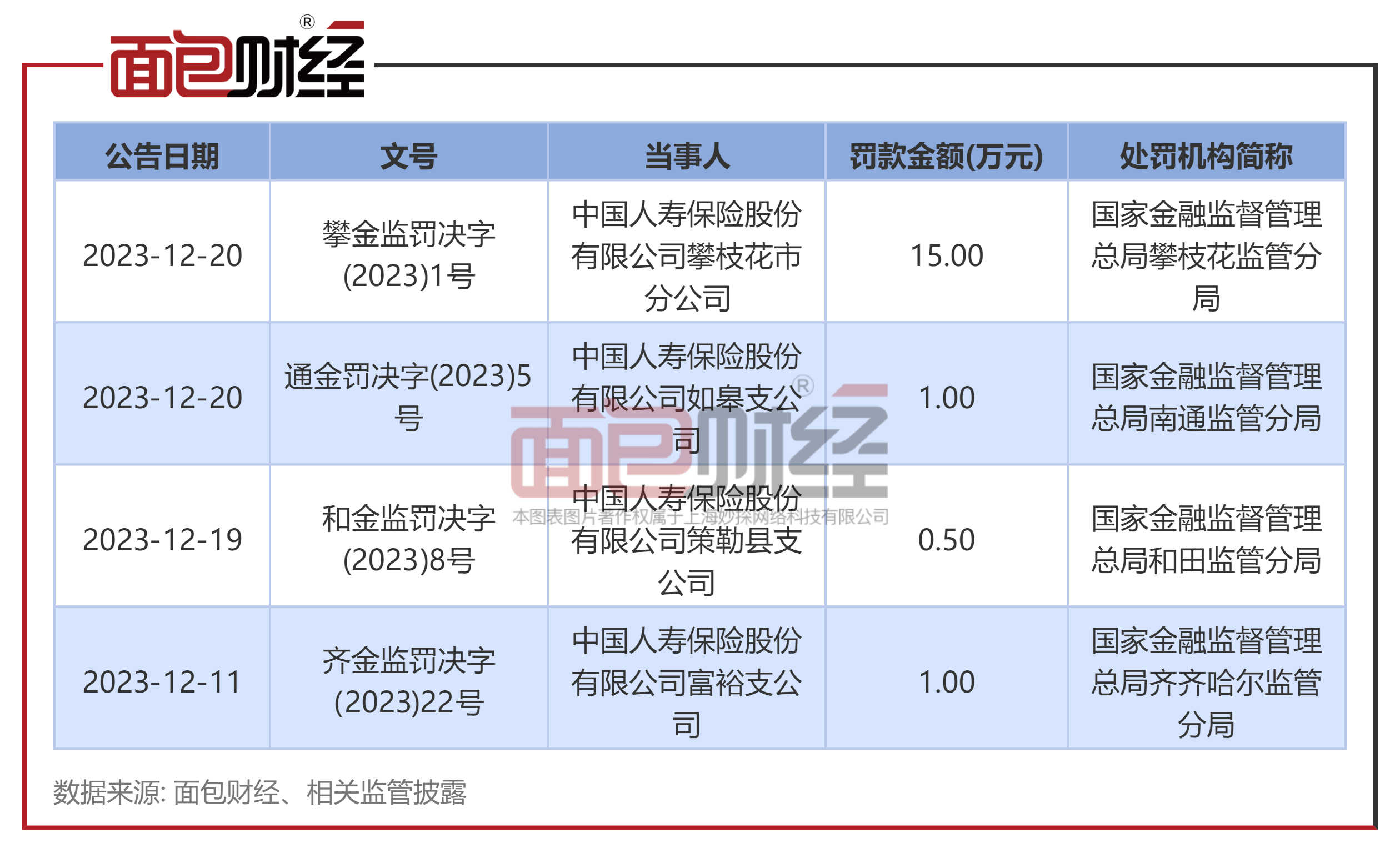12月20日,国家金融监督管理总局攀枝花监管分局公开披露对中国人寿保险股份有限公司攀枝花市分公司的行政处罚信息。