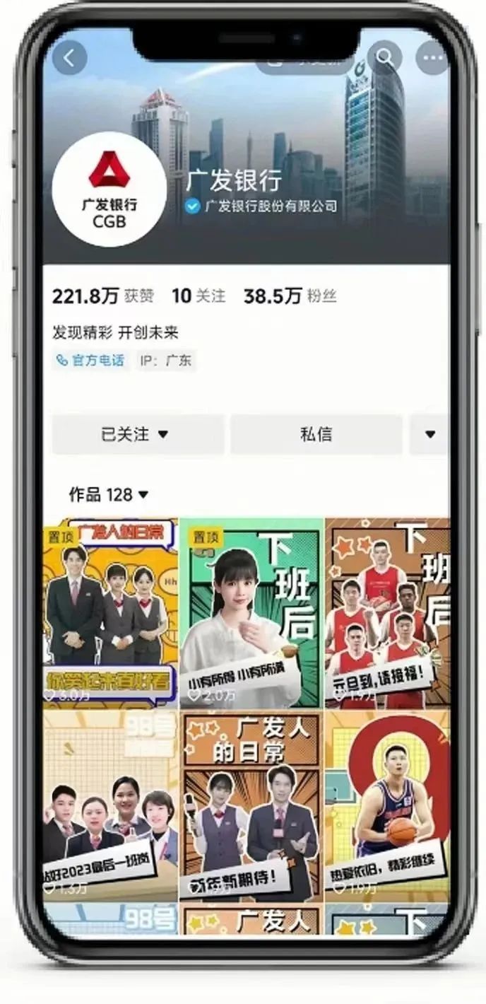 2023年4月,广发银行官方抖音账号焕新运营。广发银行以打造“年轻人喜爱的广发银行”为目标,梳理包装“广发人的日常”“下班后”“98号放映室”三大招牌栏目,以短视频为媒,展现广发服务、员工风貌、剧情科普等符合网民兴趣的内容,逐步形成抖音平台上的“广发风景线”。焕新运营后,账号粉丝量涨至38.5万人,播放量达8785万次,点赞量达215.3万次,焕新运营效果显著。