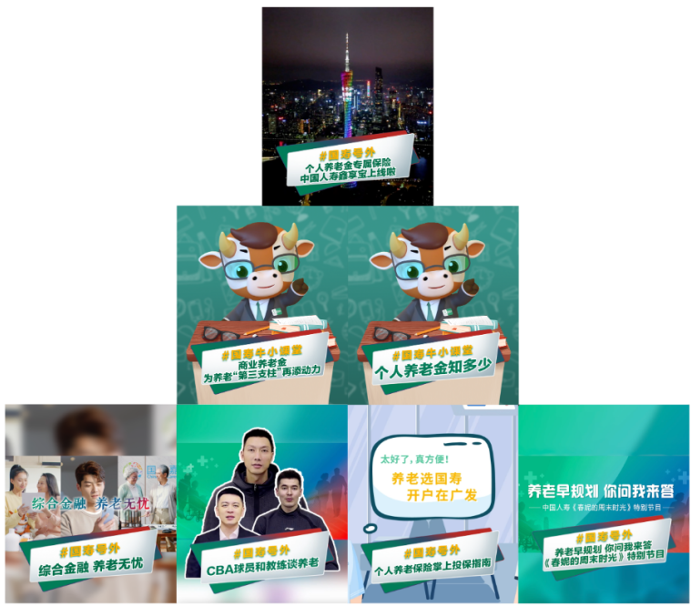 中国人寿在做好养老第三支柱知识普及公众教育的同时,围绕首批开办、业务试点、产品发布等,持续做好融媒体宣传。公司管理层第一时间办理首笔个人养老金和商业养老金业务,在全系统上下提振士气,引发各级机构热烈反响。迅速开发一系列主视觉海报、科普短视频内容,为全系统提供“中央厨房”式内容生产、分发和赋能服务,在全国各地分支机构及网点、营销职场进行展示摆放、发布相关主视觉海报等宣传物料,线上线下占领宣传阵地,迅速扩大传播声势,让消费者听得见声音、看得懂产品、办得快业务。