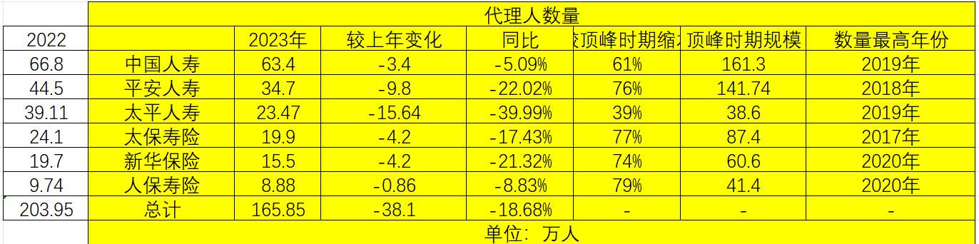 《每日经济新闻》记者统计发现,上述六大寿险代理人规模合计166万人,同比下降19%,较上年减少38万人。其中,中国人寿2023年代理人数量同比下降5%,在上市同业中降幅最小。中国人寿在年报中称,截至2023年底,队伍规模在业内率先企稳,个险销售人力为63.4万人。