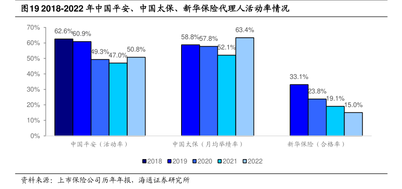 作为判断销售队伍质量的重要指标,活动率或举绩率数据也值得关注。活动率通常指的是一定时期内活跃的保险代理人数量占总代理人数量的比例,举绩率/合格率是指达到一定业绩标准的代理人所占比例。