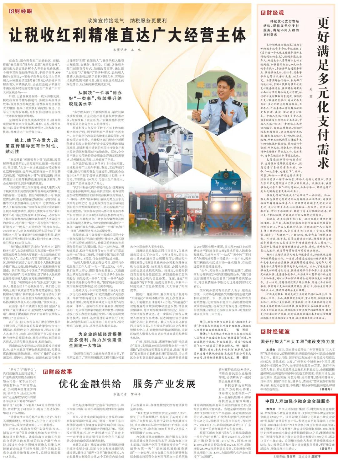 近日出版的《人民日报》,以《中国人寿加强小微企业金融服务》为题,报道中国人寿充分发挥业务功能作用和综合金融优势,持续加强小微企业金融服务,更好激发市场活力、增强发展内生动力。
