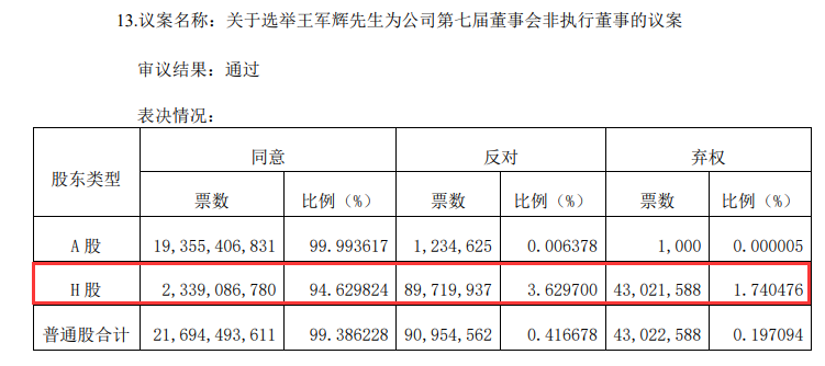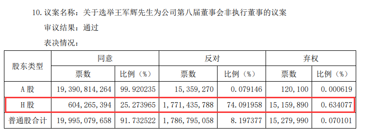 选举王军辉为第八届董事会非执行董事的投票时,参与投票的H股反对票高达74.09%。