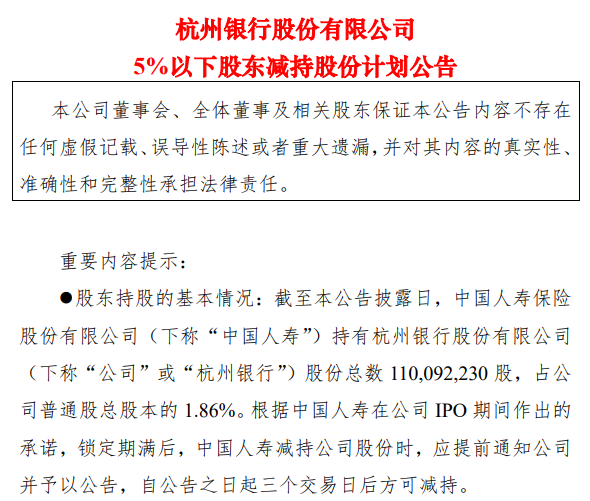 日前,杭州银行发布公告称,中国人寿拟在公告披露之日起三个交易日后的三个月内,通过集中竞价或大宗交易方式减持其所持公司股份,合计不超过110,092,230股(含本数),即不超过公司普通股总股本的1.86%。