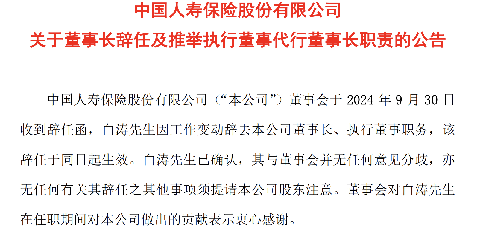 中国人寿保险(集团)公司近日发生高层人事变动,正式对外宣布了重要的人事调整决定。据公司最新公告,原董事长白涛因工作需要,已向董事会提交辞呈,辞去其担任的董事长及执行董事职务,该变动自9月30日起正式生效。