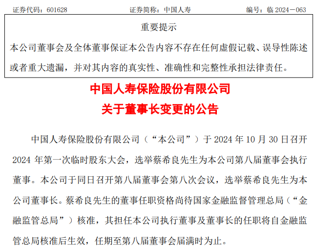 日前,中国人寿保险股份有限公司发布关于董事长变更的公告。公告显示,该公司于 2024 年 10 月 30 日召开