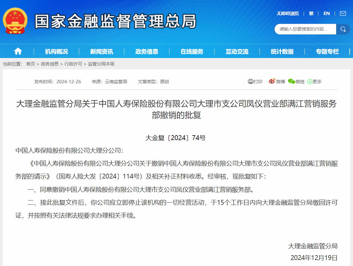 同日,大理金融监管分局同意撤销中国人寿大理市支公司凤仪营业部满江营销服务部。要求该公司接此批复文件后立即停止该机构的一切经营活动,15个工作日内缴回许可证。