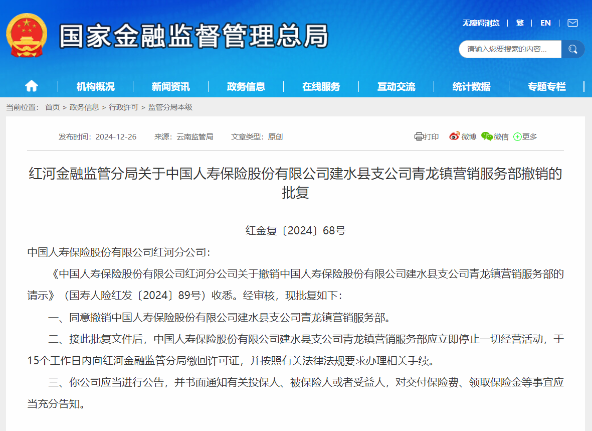 12月26日,国家金融监督管理总局网站发布的行政许可文件显示,红河金融监管分局同意撤销中国人寿保险股份有限公司(简称“中国人寿”)建水县支公司青龙镇营销服务部和个旧市支公司倘甸营销服务部,要求该公司接此批复文件后上述2家营销服务部立即停止一切经营活动,15个工作日内缴回许可证;该公司应当进行公告,并书面通知有关投保人、被保险人或者受益人,对交付保险费、领取保险金等事宜应当充分告知。