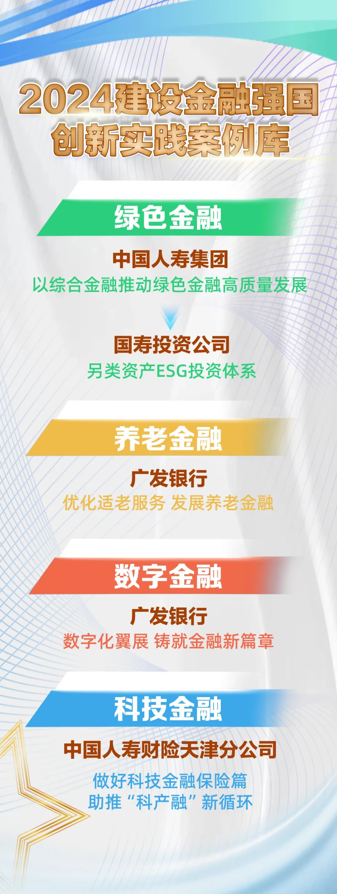 近日,由人民网主办的“2024人民财经论坛”在京举办,论坛同期上线人民网“2024建设金融强国创新实践案例库”,汇集来自金融行业服务五篇大文章的55个优秀创新实践案例,宣传展示一批金融强国建设过程中的创新举措、务实成果,为加快建设金融强国,走好中国特色金融发展之路贡献智慧和力量。其中,中国人寿多个案例入选。