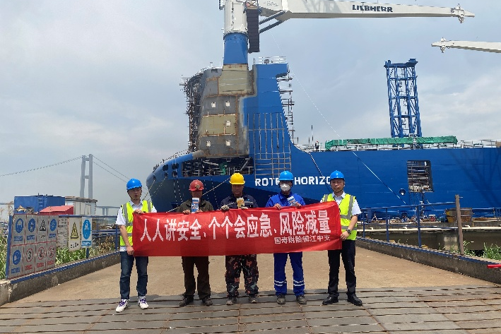 江苏分公司组织专项工作组赴当地某船厂开展“防灾减灾风险减量行动”活动。针对该厂区易受汛期强降雨及台风影响的地理特点,重点对码头、船坞、吊机及重大设备等开展防洪抗台防灾防风服务、对造船车间开展防火防爆风险检查。