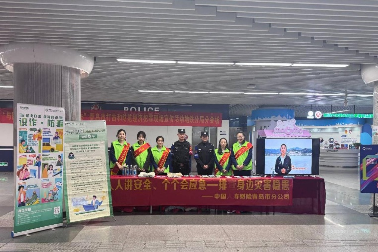青岛分公司联合地铁公安及行政执法大队,在地铁站厅设置宣传展台、悬挂横幅、摆放宣传展板、多媒体循环播放防灾知识宣传视频、发放宣传资料,向过往市民普及防灾减灾知识。