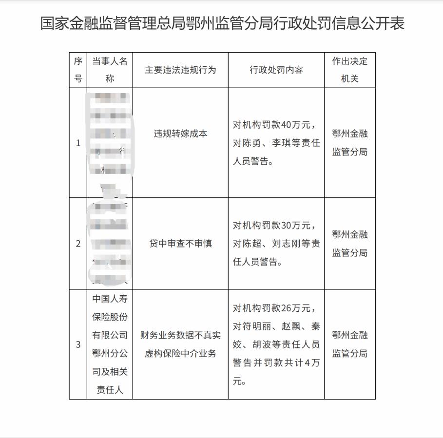 2025年9月30日,国家金融监督管理总局鄂州监管分局披露的行政处罚信息显示,中国人寿保险股份有限公司(02628.HK,以下简称“中国人寿”)鄂州分公司因财务业务数据不真实、虚构保险中介业务,被罚款26万元。同时,符明丽、赵飘、秦姣、胡波等上述违规行为的主要负责人,被警告并罚款共计4万元。