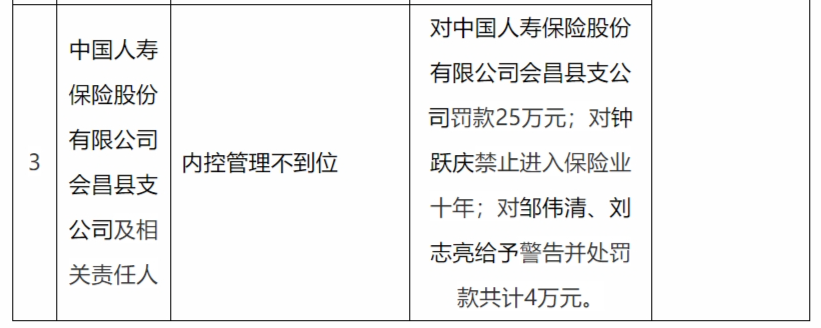 12月26日,国家金融监督管理总局赣州监管分局行政处罚信息公开表显示,中国人寿保险股份有限公司会昌县支公司,内控管理不到位,被罚款25万元。