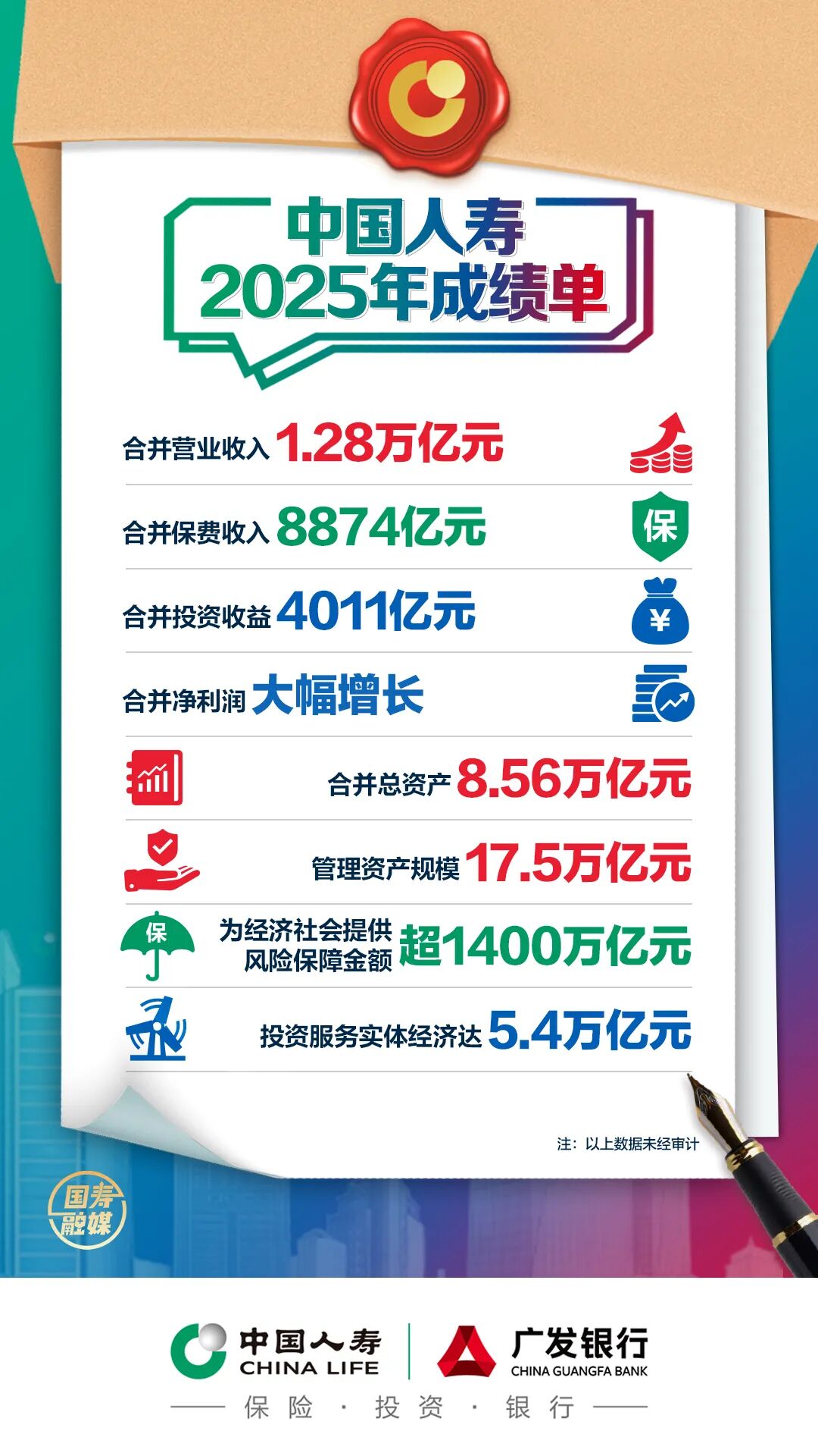 2025年,全系统真抓实干、攻坚克难,集团“333战略”平稳起步,以最佳业绩实现“十四五”顺利收官,为开创“十五五”高质量发展新局面打下坚实基础。持续加强党的全面领导,进一步健全学习贯彻习近平总书记重要指示批示精神闭环落实机制,党建工作系统构建,形成全新格局。经营绩效再创新高,集团合并营业收入1.28万亿元,同比增长11.3%;合并保费收入8874亿元,同比增长7.4%;合并投资收益4011亿元,同比增长17.6%;合并净利润大幅增长;合并总资产8.56万亿元,同比增长14.4%;管理资产规模17.5万亿元,同比增长11%。经济减震器和社会稳定器功能更好发挥,为经济社会提供风险保障金额超1400万亿元,投资服务实体经济增加8000亿元达到5.4万亿元。风险防控有力有序有效,寿险公司、财险公司、养老险公司风险综合评级,资产公司年度监管评级均获行业最高等级。