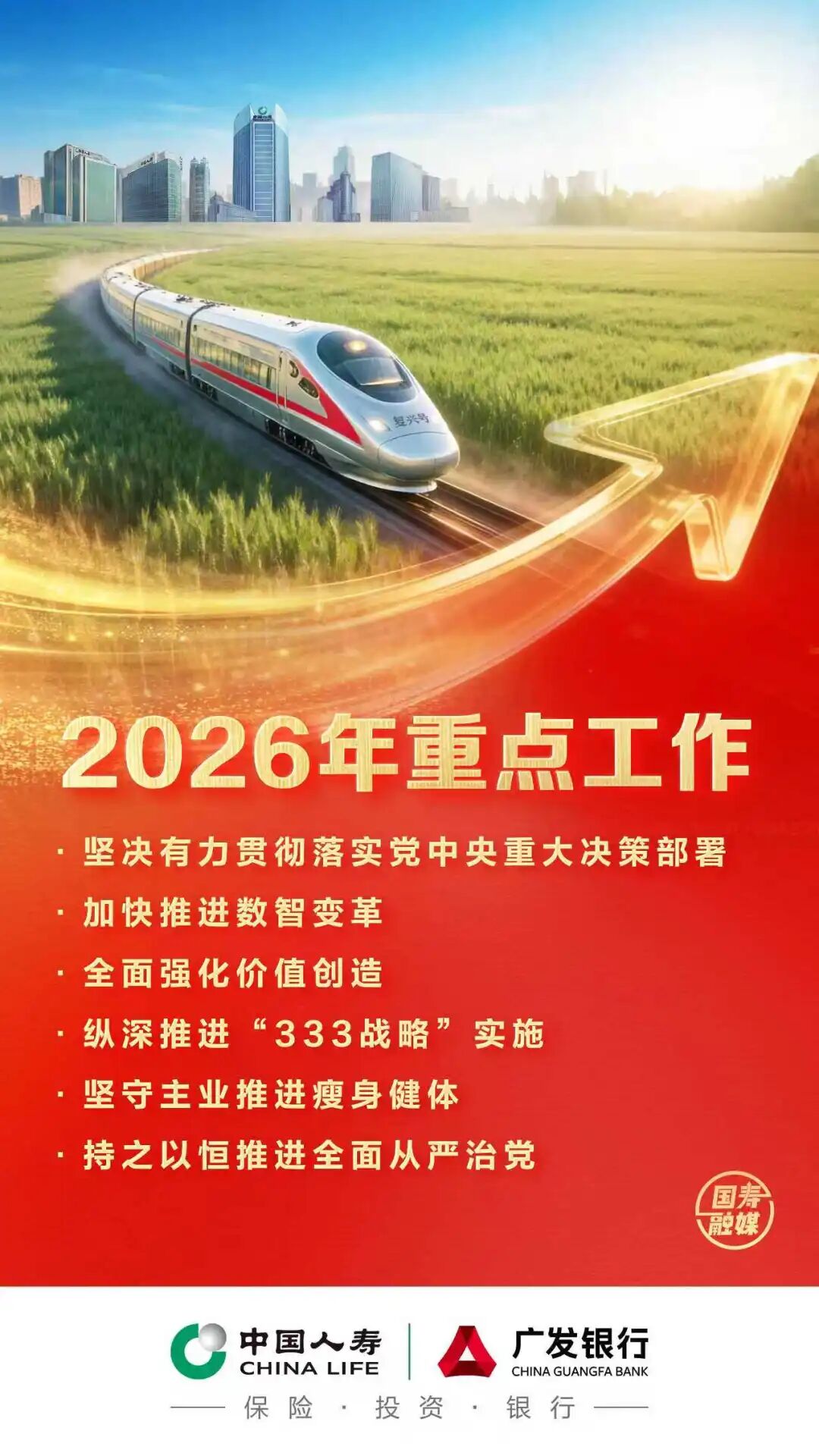 全系统要全力做好2026年重点工作,坚决有力贯彻落实党中央重大决策部署,加快推进数智变革,全面强化价值创造,纵深推进集团“333战略”实施,坚守主业推进瘦身健体,持之以恒推进全面从严治党。全力实现经营业绩稳中有进、新增长极培育加力加速、数智变革成效初见、风险防控扎实有效等高质量发展目标,为中国式现代化贡献国寿力量。